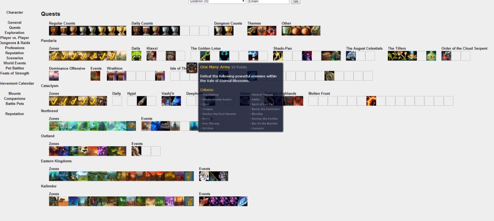 O Simple Armory é a forma mais prática pra dar uma olhada no status geral do seu personagem – ele mostra de forma bem clara tudo o que você tem ou não tem no jogo. Pode ser mais fácil começar seu planejamento/decisão de objetivos por ele do que por sua janela de conquistas, por mostrar exatamente onde/em que expansão está cada conquista/itens que faltam pra você.