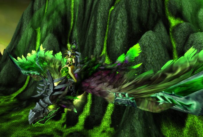 Parece bobeira, mas um mínimo detalhe faz toda diferença em um transmog com este conjunto para bruxos. O Glifo de Esfera Verdejante fica perfeito caso esteja usando a peça de cabeça e ombros *-*~. Um outro plus para combinar com qualquer conjunto feito com base nestas três peças é a montaria Terrorasa Corrompido. Os melhores 150.000 cristais de apexis gastos na expansão 😉