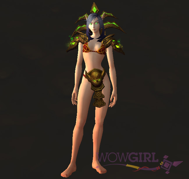 Para esta sugestão, é necessário ter completado o Modo Desafio de Masmorras de Pandaria com medalha de ouro, pois nela utilizamos 2 peças deste conjunto. Apesar dos tons de marrom/roxo, o set de Modo Desafio foi minha primeira opção quando completei todas as peças do Conjunto Lorde Eredar. Veja os itens utilizados: