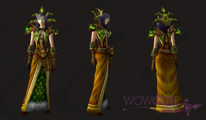 De todas as combinações de torso possíveis para estes três itens, nenhum em minha opinião ficou tão perfeito quanto o Abraço da Serpente de Vento. Este vestido tem exatamente os mesmos tons dourados e verdes do conjunto e fica lindíssimo, tanto em personagens masculinos quanto femininos! De todos os itens do set abaixo, ele pode ser o mais complicado de se obter: ele é saqueado do Avatar de Hakkar, um dos chefes do Templo Submerso (Sunken Temple) no Pântano das Mágoas, e a taxa de saque dele é bem baixa. Peguei o meu em pouco mais de 15 tentativas, que podem ser feitas super rápido. O set completo utiliza os seguintes itens: