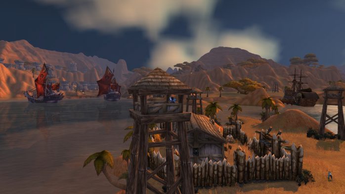 A Ilha da Peleja é esse pedacinho de terra exatamente embaixo de Durotar – então, adivinhem, tem muito navio da Horda envolvido. Como não seria sensato fazer com que parássemos dentro de um navio da Horda (Aliança ficaria como nessa situação, né?), paramos em uma guarita (secretamente eu chamo de “casinha do salva-vidas”) de madeira de frente para o mar, porque basicamente isso é tudo o que tem pra ver por lá. Ok? Ok.