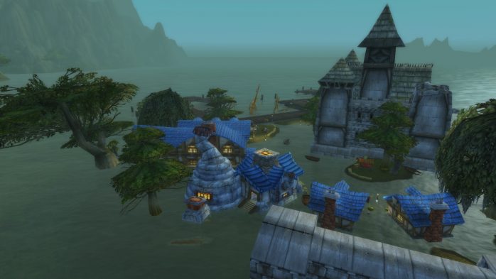 Agora, lembram do que eu disse sobre os destinos afetados pelo Cataclisma? Pantanal foi um mapa que sofreu bastante com a fúria do Asa da Morte, e tanto o primeiro quanto o segundo destinos mostram locais destruídos em decorrência disso. Nesse caso, logo à frente fica o Porto de Menethil (que um dia foi uma próspera cidadezinha portuária mas hoje está parcialmente submersa e caiu no esquecimento):