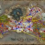Descobri esse mapa no mapwow. Não sei se ainda está incompleto como a imagem sugere. Mas, ele mostra os Horde e Alliance Travel Paths, em vermelho e azul respectivamente, além dos nomes das cidades e zonas.