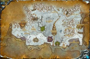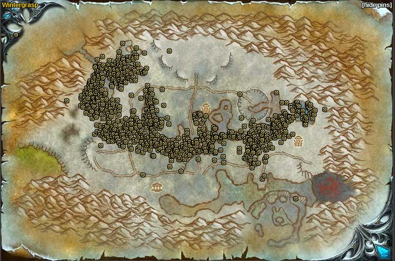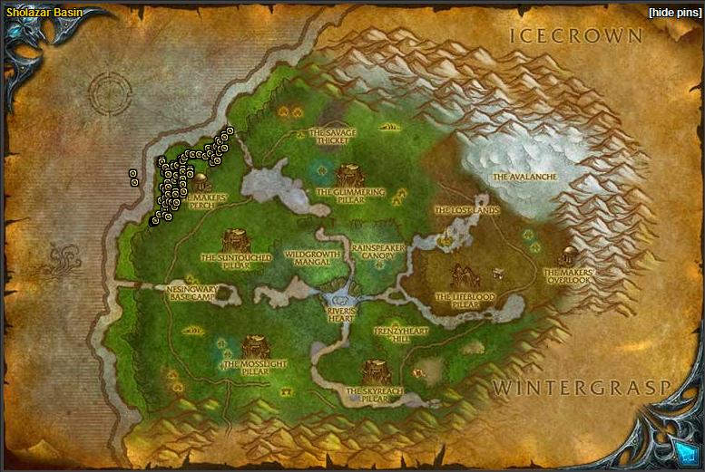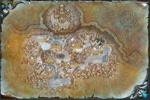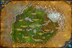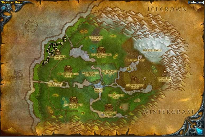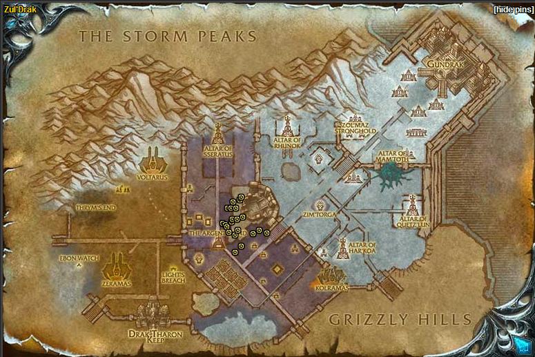 Em Zul’Drak o mapa mostra os Mossy Rampagers. Não é muito recomendável esse spot, pois, apesar de possuirem também ~30% drop rate, os mobs estão espalhados e misturados com outros que não dropam Crystallized Life.