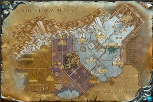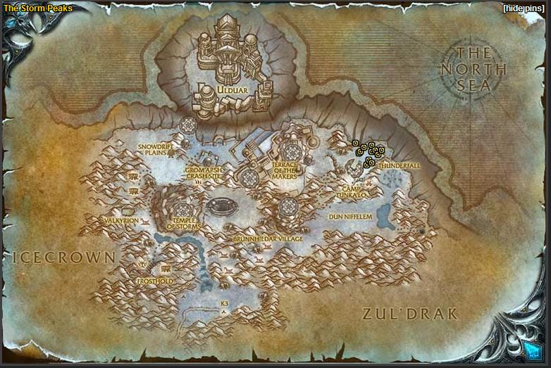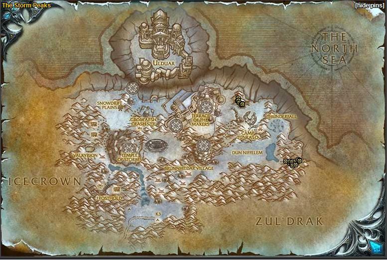 Em The Storm Peaks os mobs que dropam Crystallized Fire são os Seething Revenants e Wailing Winds, mostrados no mapa abaixo. O drop rate é bem menor mas não é tão ruim. Além disso, é um bom lugar para farmar Relic of Ulduar.