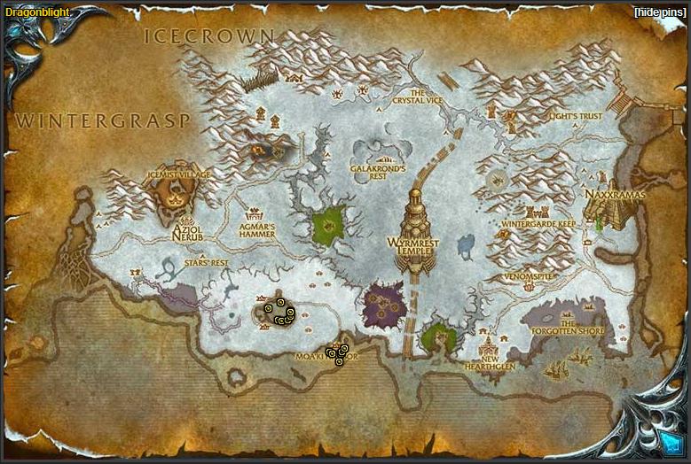 A seguir, onde farmar cada um, lembrando que em Wintergrasp a maioria dos mobs só é visível quando a sua facção estiver no controle da área.