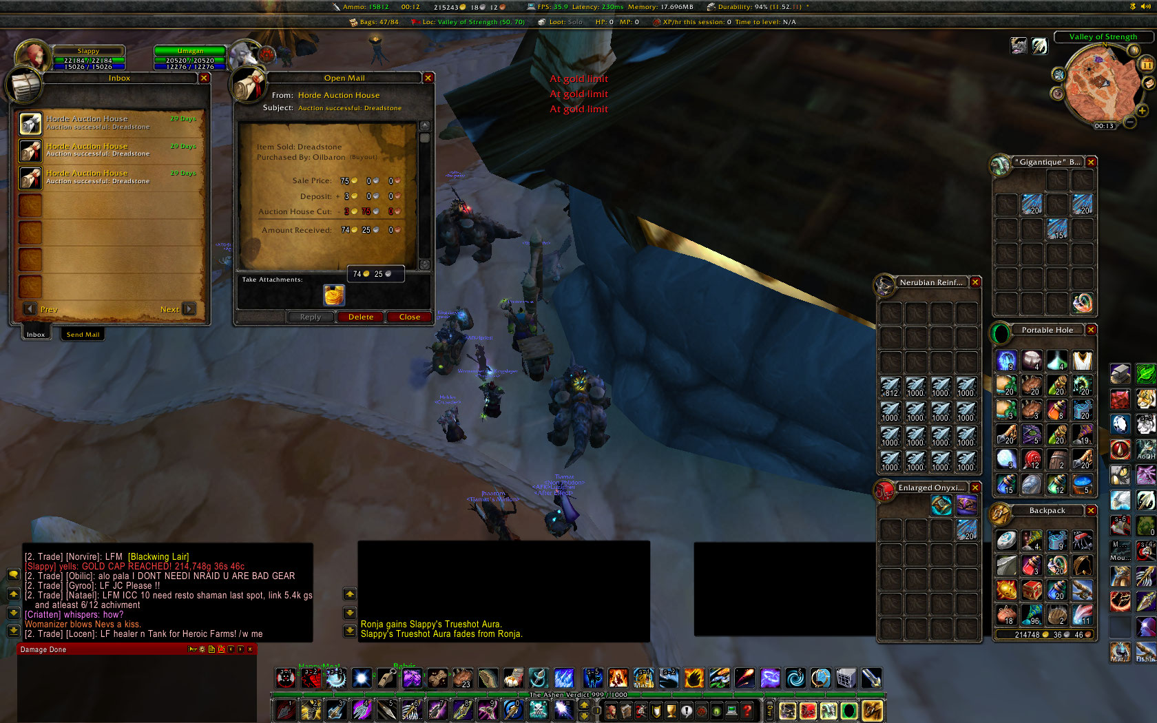 Comecei a farmar há 3 meses e meu único objetivo era não perder muito tempo on-line pra isso e das duas horas que jogava por dia, 20 minutos eram dedicados na AH. Quando decidi atingir o gold cap tinha em torno de ~40k gold.