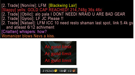Um player chamado Slappy do server Frostmane, conseguiu juntar o máximo total permitido em golds: em torno de 215 mil. Provavelmente existem outras contas com esse montante, mas esse player fez questão de publicar sua história no forum oficial: