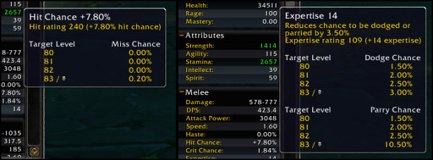 No Cataclysm, a tela do character vai mostrar facilmente quanto de cada stat você precisa pra chegar ao cap. Isso é fantástico! A ferramenta exibe cálculos para chegar no limite de cap do Expertise, Hit Rating, e outras stats que estarão disponíveis. Eu tenho vários alts mas não necessariamente sei de cor quanto de que stat precisa pra ser hit capped ou coisa do gênero. Isso realmente vai ajudar, não só pros alts mas na hora da decisão de dar roll em um novo roxinho ou não.