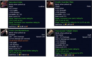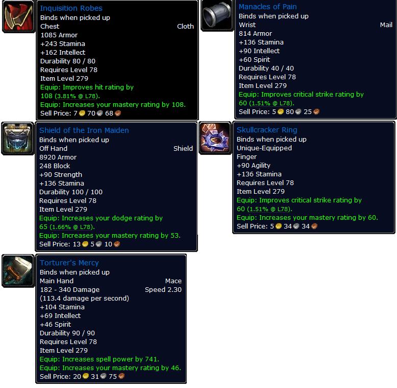 Parece que os itens azuis são bem semelhantes aos drops de Icecrown Citadel 25-man Normal. Quanto ao Item level, os itens verdes de quest possuem Item Level 272 e os azuis da instância, 279, portanto, maior que os itens heroic 25-man de Icecrown Citadel, que possuem Item Level 277.