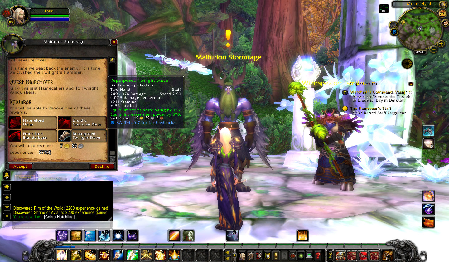 Na primeira quest que fiz com recompensa de itens, aparece o Malfurion Stormrage, todo imponente no seu novo modelo. A quest é War on the Twilight’s Hammer, uma quest fácil de matar 14 porcos mobs e as recompensas são todas itens verdes: