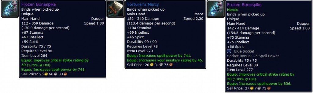 Novamente comparando, desta vez com arma de caster, Frozen Bonespike, normal e heroic, do Lord Marrowgar:
