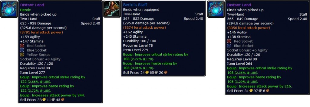 Como não sei muito sobre os itens de druida no WotLK, procurei a staff de Icecrown Citadel para poder comparar: Distant Land, versão Heroic e Normal: