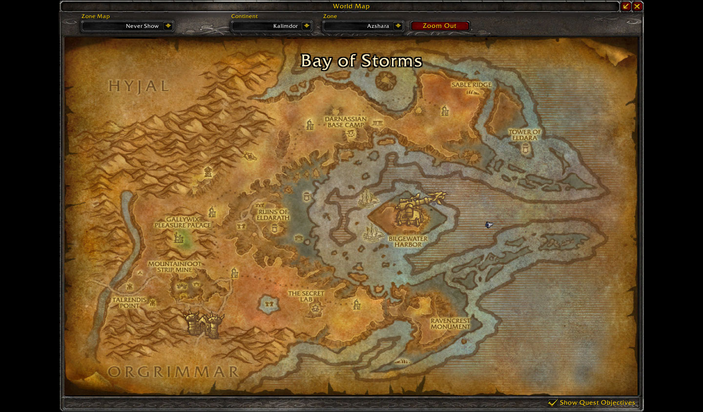 Azshara mudou totalmente. Lembram da ilha cheia de gigantes elites no meio da Bay of Storms? Provavelmente não, pois era uma das áreas mais abandonadas de todo Kalimdor. Só consigo me lembrar de três coisas importantes que aconteciam em Azshara: O pet dragão azul que dropava dos elites; A quest de mage, pra pegar o Polymorph Pig e pescar Stonescale eel, um peixe que tinha todo um esquema para ser pescado, já que só aparecia em certos lugares e horários. Era caríssimo durante a época do classic, já que era usado em flasks – Flask of the Titans – e poções. Minha montaria voadora foi comprada graças a esse peixinho!