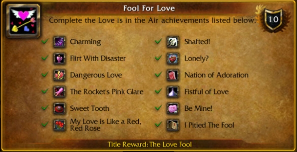 Para completar o Fool for Love e ganhar o titulo The Love Fool é preciso completar os achievements abaixo exceto 3: Perma-Peddle, Tough Love e Lovely Luck Is On Your Side.