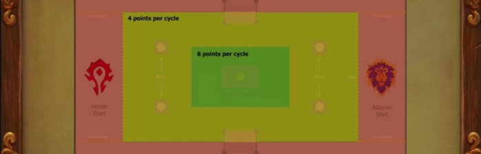 Este mapa não é reto como o campo de batalha Warsong, ele tem níveis de acordo com a sua pontuação onde o vermelho é o local mais alto, amarelo é o meio termo e o verde é o mais fundo. O cenário é cheio de totens de estátuas, com colunas e um tom de branco/bege, simplesmente lindo!