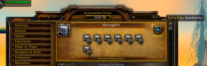 Isso não válido somente para as Proezas Memoráveis, eu ganhei a conquista[achievement] Viveiro[Menagerie] de Combate de Mascote[Pet Battle] na minha monge[monk] e na Coxinha ele aparece normalmente. 🙂