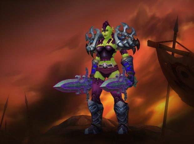 Acho que quando começamos esta coluna de transmog vocês imaginavam que ia ser uma enxurrada de humanas e elfas sangrentas cuticuti, né? Aí começo com uma morta-viva de joelhos expostos. Agora, continuando com a série dos transmogs da nossa equipe, trazemos uma orc fêmea – ou como gosto de chamar, “orquete”: Coxinha, guerreira toda trabalhada no roxo.