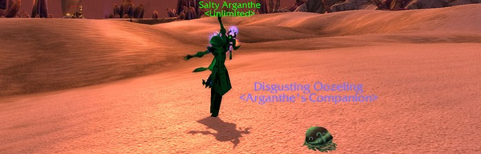 Silithus é cheia de mobs de vários tipos, que dropam um monte de coisas inúteis e… sacolas gosmentas. Existem dois tipos de mobs lá que dropam essas sacolinhas: os Dragatracas e Dragasmagas. Cada um desses mobs tem chance de 8% de dropar esas sacola, e nela, dentre várias plantas e itens cinzas, pode vir uma Gosmícula Nojenta, mascote extremamente raro e sempre procurado na Casa de Leilões (eu juro que peguei um monte de saquinhos pra mostrar pra vocês algum deles com o mascote dentro, mas né… como estou condenada a ser sem sorte com drops de mascote, claro que ela não veio).