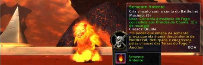 Elas estão marcadas na imagem acima pra facilitar um pouco, mas tente passar o mouse por cima das ‘pedrinhas’ em volta do portal. Se ela ficar clicável, é a semente. Todos podem ve-las, mas apenas druidas podem pegar. Você pode carregar até 5 na sua bolsa (aliás, só existem 5 sementes ali), elas não expiram e são vinculadas à conta Battle.net. Ao usar a semente, você ganha um buff de uma hora, chamado Essência Flamejante, que faz com que na próxima hora você vire um gato das chamas sempre que usar sua forma de gato. O buff persiste após a morte, como o de flask.