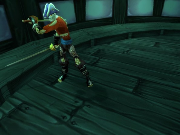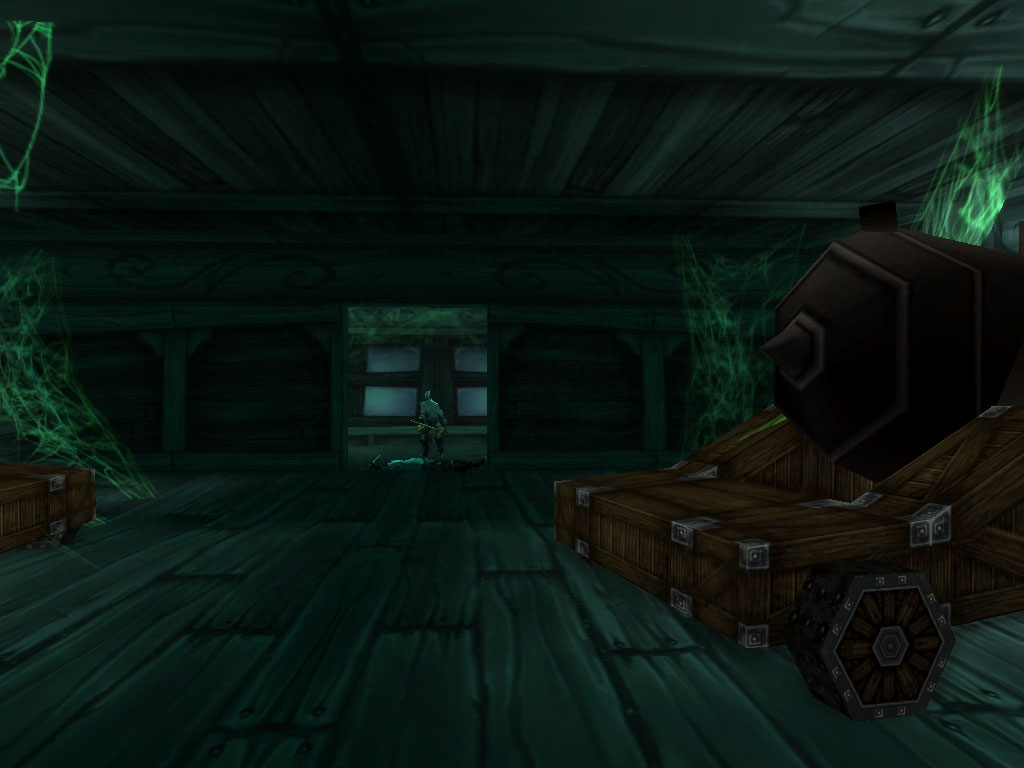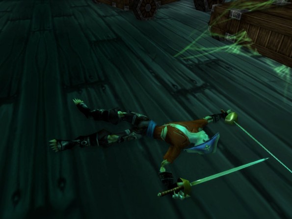 Dareon aproximou-se devagar, tentando não causar alarde, mas o capitão ouviu algo e saiu da cabine. Bateu uma vez em um dos canhões, causando um ruído seco que se espalhou pelo porão abafado. Então Dareon atacou-o por trás.