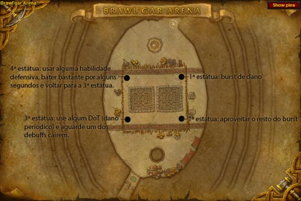 É necessário que preste bastante atenção aos debuffs ativos, para tentar resetá-los a tempo e ganhar algum tempo para finalizar as demais estátuas. Minha sugestão de estratégia é a seguinte:
