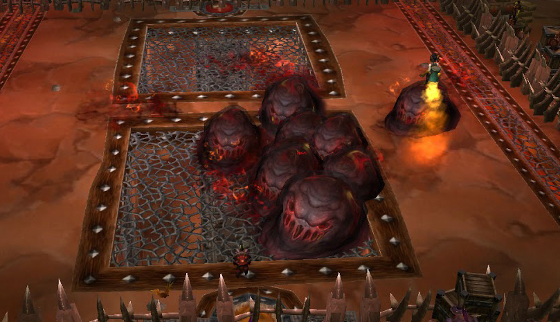 Se você for DPS longo alcance, você pode preferir ficar direto em baixo, sem usar os trampolins. Neste caso é preciso tomar cuidado com Raaaargh, que usa duas habilidades: Malho que causa bastante dano, por isso é necessário sempre estar em movimento, e Esmagar Crânio, que interrompe o lançamento de feitiços e impede que o jogador lance uma nova habilidade novamente por alguns segundos.