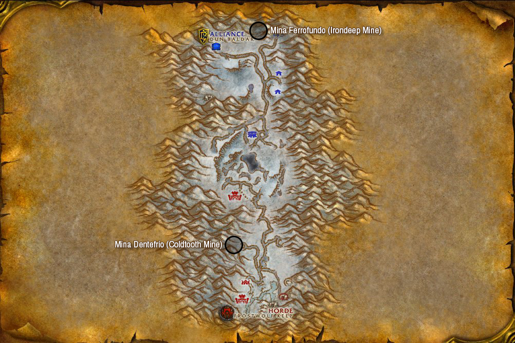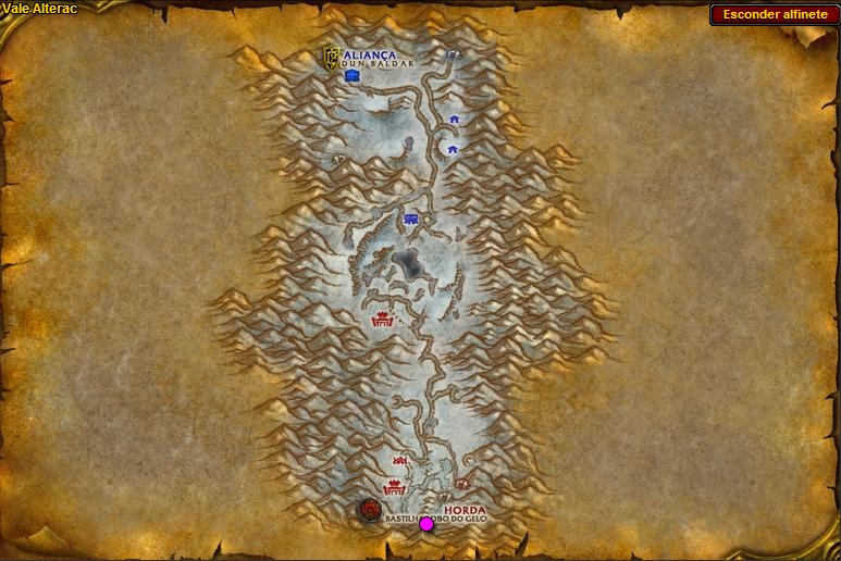 Não existe um mapa interno das minas de Vale Alterac, mas felizmente o caminho para entrar nas duas e alcançar o chefe é o mesmo! Abaixo um mapa da localização das minas e o caminho que precisa seguir: