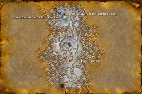 Nessa conquista é preciso contar diretamente com a sorte, pois nem sempre as torres e casamatas estarão livre da guarda de jogadores. As sugestões acima são baseadas na minha própria experiência com uma classe que não pode contar com habilidades como Furtividade. No mapa acima, jogadores da Aliança podem usar como referência as Casamatas, enquanto jogadores da Horda podem focar na Torre do pontal e se manter ‘escondido’ até que um jogador capture a bandeira. Quando ela estiver cinza, aguarde este jogador sair (maioria dos casos) ou mate-o para recuperá-la em seguida. Uma das maiores desvantagens de capturar qualquer construção nesse Campo de Batalha é que o tempo total necessário para destruí-lo é de três minutos, o que pode fazer com que aquele jogador impaciente desista de guardá-la e corra para farmar pontos de Honra ajudar o time.