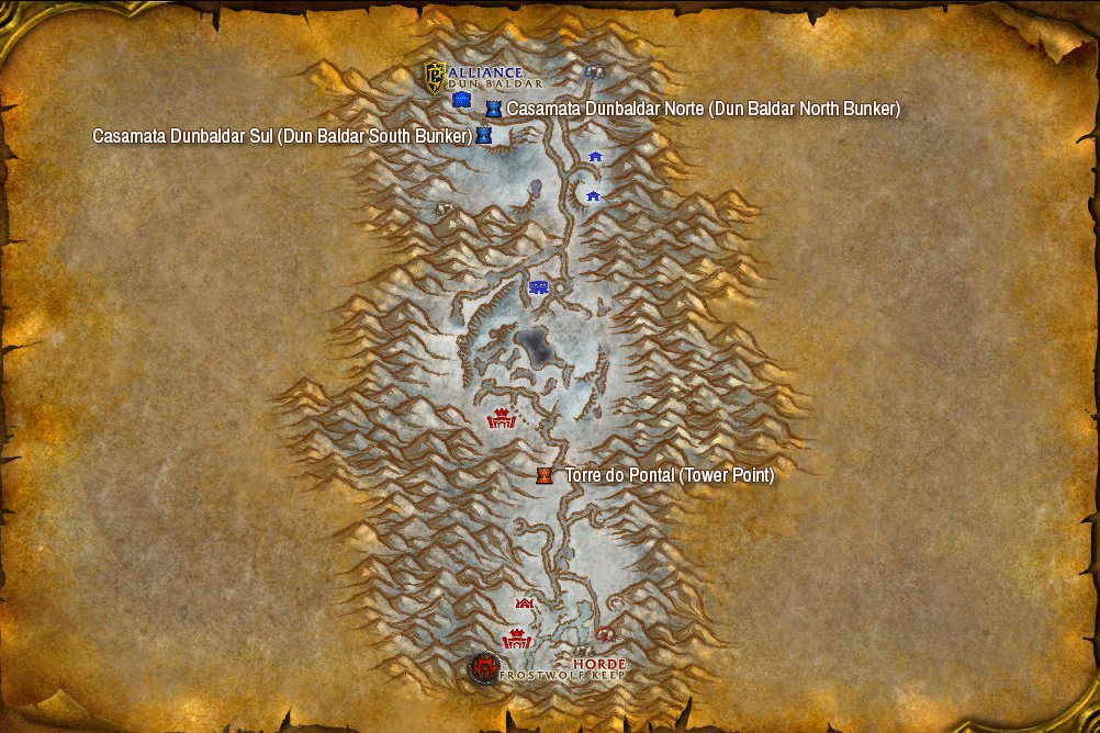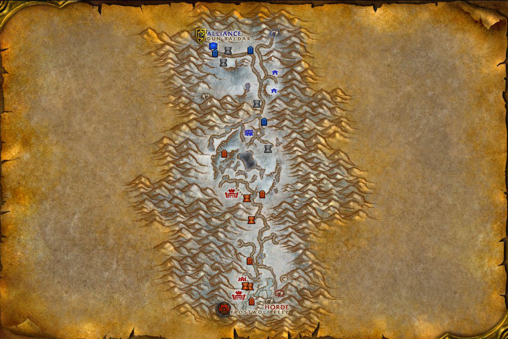 - Envie aqueles jogadores que podem se mover sem ser detectados pelos inimigos como Ladinos, Druidas e Caçadores em dois grupos para capturar Torres/Casamatas em dois grupos de até 5 pessoas. O primeiro grupo deve ir primeiro à construção mais próxima do meio do Campo: Casamata Larpétro (Stonehearth Bunker) para a Horda e Torre Sanguefrio (Iceblood Garrison) para a Aliança. Aguarde até que seja destruída e o mesmo grupo segue para a Casamata Dun Baldar Norte (Dun Baldar North Bunker) para a Horda e Torre do Lobo de Gelo Oeste (West Frostwolf Tower) para a Aliança. Capture e aguarde até que seja destruída. O segundo grupo deve ir primeiro à Casamata Asálgida (Icewing Bunker) para a Horda e Torre do Pontal (Tower Point) para a Aliança. Aguarde até que seja destruído e o mesmo grupo segue para a Casamata Dun Baldar Sul (Dun Baldar South Bunker) para a Horda e Torre do Lobo de Gelo Leste (East Frostwolf Tower) para a Aliança;
