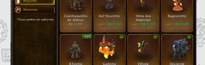 A partir de hoje, é possível fazer a compra de mascotes e montarias diretamente pela interface do jogo. Os valores estão em reais, e o modo de pagamento usado é saldo Battle.net (que você pode adquirir com boleto, cartão nacional ou transferência bancária) ou cartão de crédito, e a autorização para a transação é feita com a sua senha da Battle.net. Confiram algumas screenshots da loja: