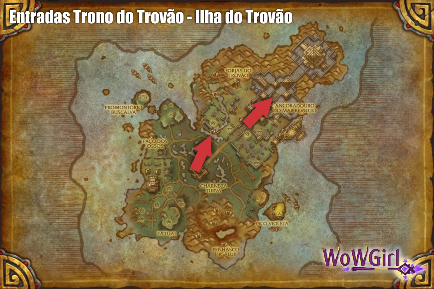 O Trono do Trovão fica na Ilha do Trovão. Para se chegar à Ilha do Trovão, basta pegar um portal que fica na Guarnição Shado-Pan, em Estepes de Taolong. Essa raide tem 12 chefes no modo normal, mais um extra, acessível apenas no modo heróico.