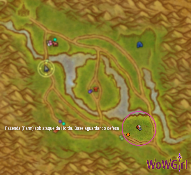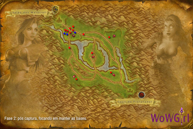 Como nesse exemplo a Aliança está tentando a conquista, certifique-se de manter a Fazenda bastante protegida, pois o ponto de respawn da Horda é o Covil do Profanador e, sem nenhum cemitério controlado, todo inimigo reaparecerá próximo à Fazenda. Esta foi a mesma estratégia que usei para conseguir minha conquista, e ela funciona perfeitamente. Recomendo que o líder que estiver controlando a estratégia no CB permaneça na Serraria a fim de controlar a movimentação nas demais bases.