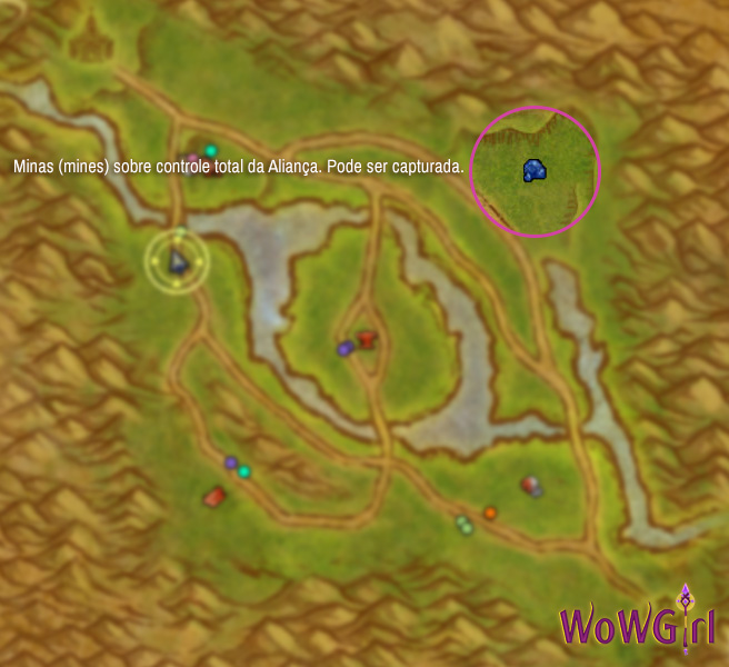 Na imagem acima, a Mina de Ouro (gold mine) está sobre controle total da Aliança. Caso um membro da Horda a pegue, contará como captura e não defesa.