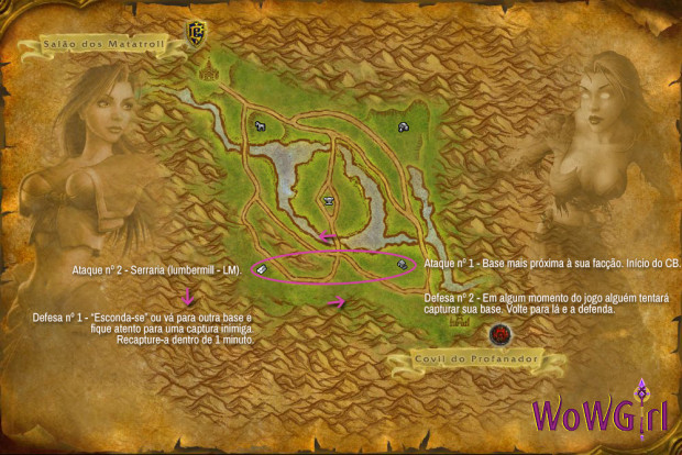 No exemplo, sou uma jogadora da Horda que tentarei atropelar Paladinos e Cavaleiros da Morte para tentar chegar primeiro e capturar a Fazenda (ataque 1). Após capturá-la, meu segundo passo e ir para Serraria, onde possivelmente alguns outros companheiros da Horda já estarão em uma batalha frenética por essa base. Chego e vou diretamente a bandeira para capturá-la. Caso o seu time esteja em desvantagem, ajude a eliminar alguns inimigos para evitar interrupções durante a captura (ataque 2).