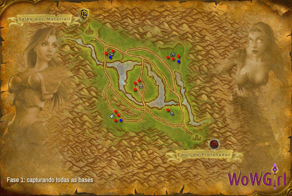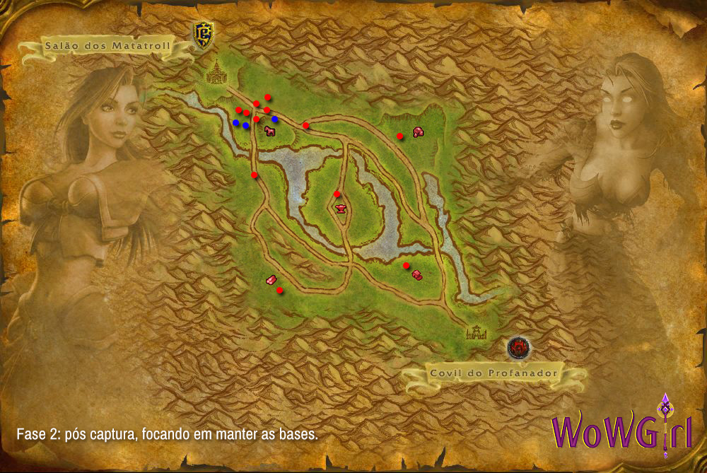 No mapa acima, os pontos vermelhos indicam DPSs e os azuis, curadores. Divida seu time de modo que todas as bases (exceto a Fazenda, que provavelmente não será assaltada a princípio) seja atacada ao mesmo tempo e com quantidades semelhantes de jogadores. Certifique-se de mandar ao menos um curador para as 3 bases que provavelmente terão bastantes inimigos (no nosso exemplo Serraria, Mina de Ouro e Estábulos, base “principal” da Aliança. Após matá-los, como não terão nenhuma base capturada, o ponto de respawn será o Salão dos Matatroll, próximo à Estábulos.