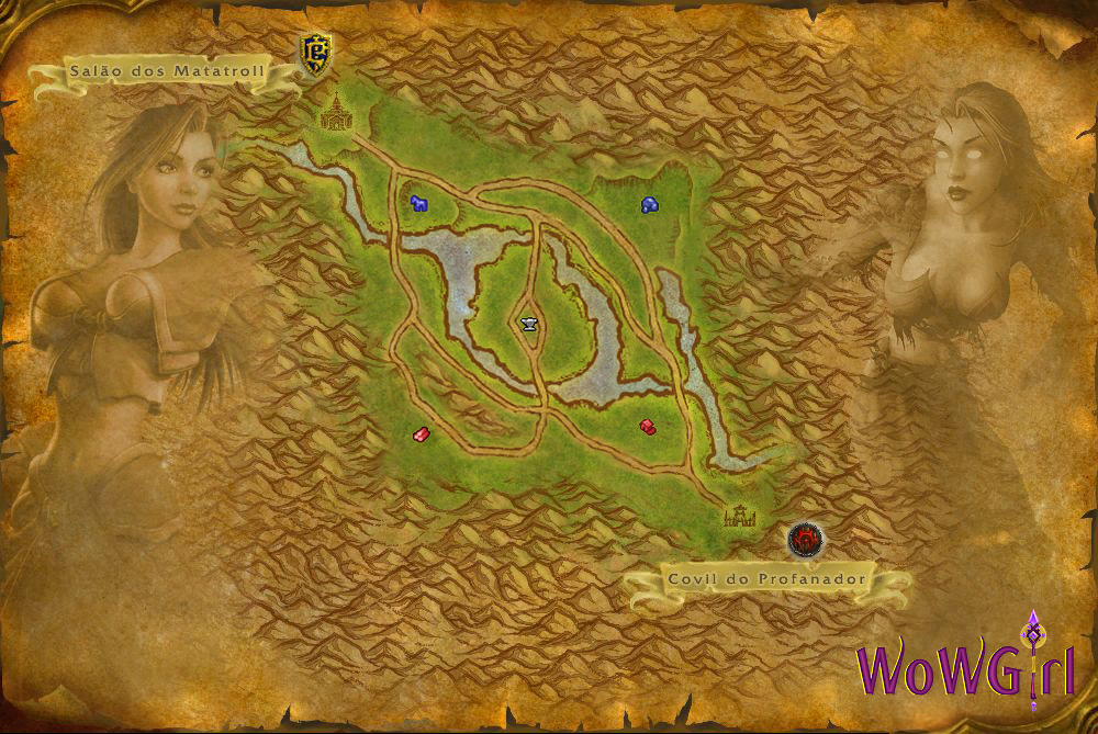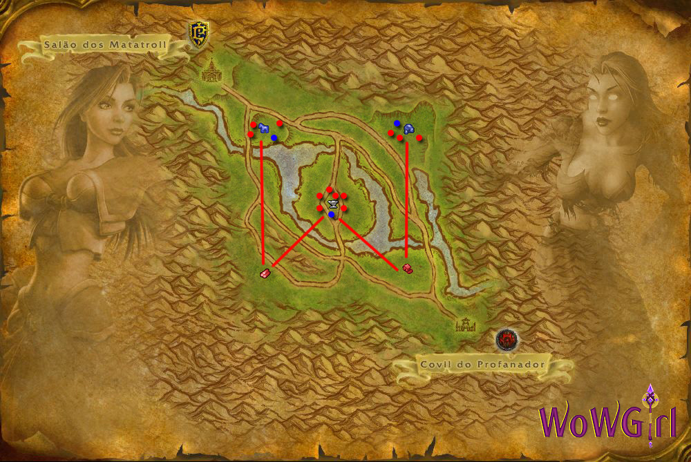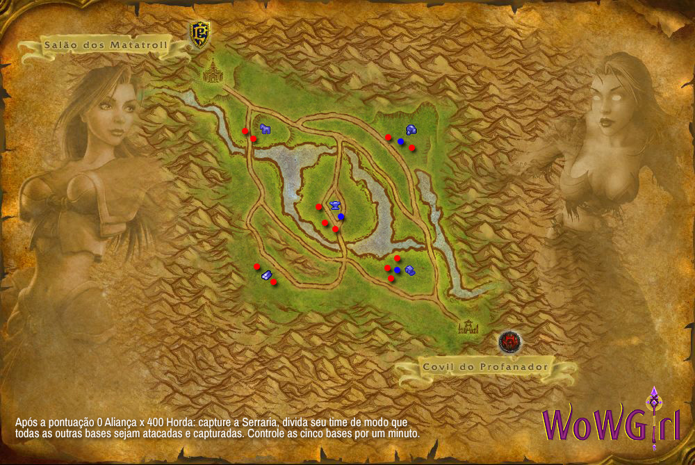No mapa acima, os pontos vermelhos indicam DPSs e os azuis, curadores. Após o time adversário completar 400 pontos de recurso capture a Serraria, divida seu time em grupos estratégicos para tomar as demais bases, e ganhe a vitória por 500 pontos de diferença e controlando 5 bandeiras: