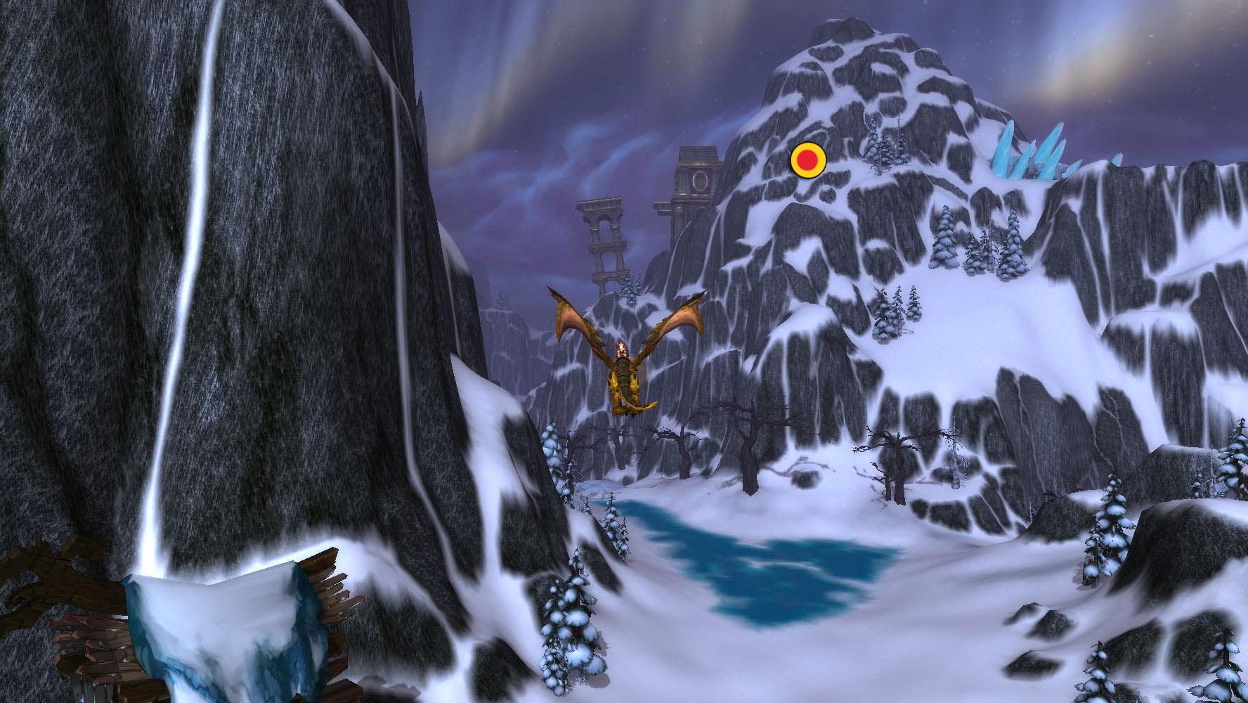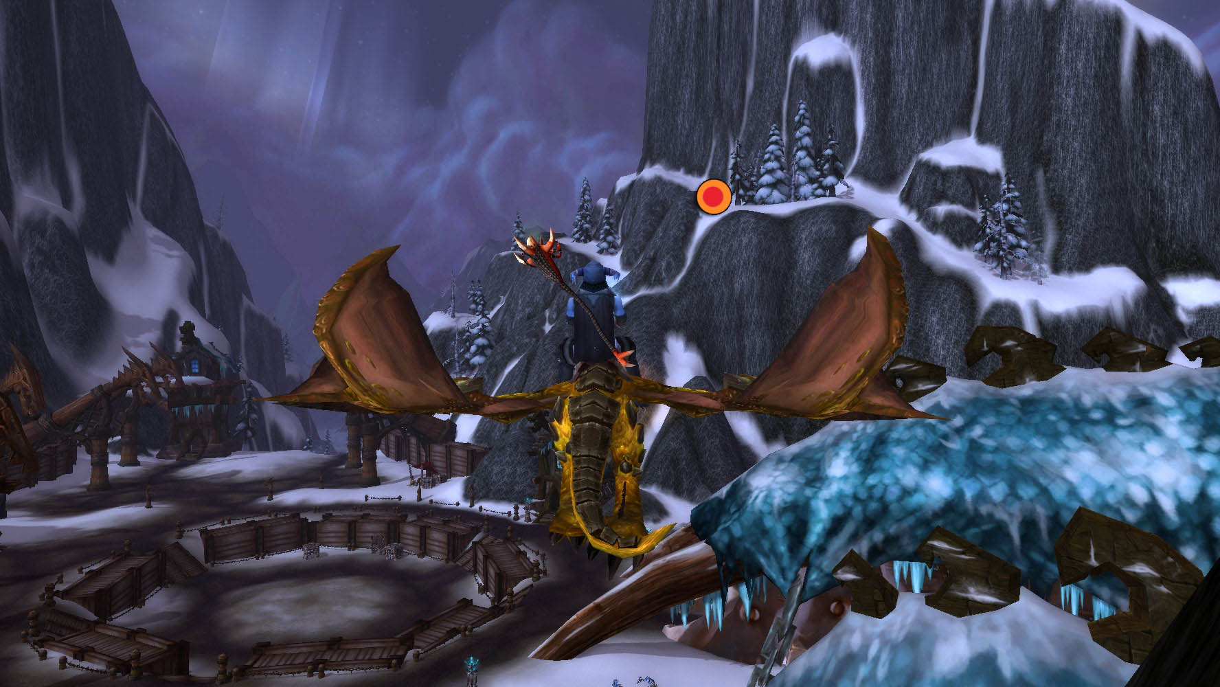 É a rota mais extensa do mapa e um dos ninhos mais difíceis de se encontrar. Sempre me localizo através da última construção à direita de ulduar, que parece um edifício. Vôo até a ponta, olho na direção das montanhas e sigo reto, até um pequeno morro de neve um pouco abaixo e à esquerda das outra grandes construções, como mostra a imagem. Durante a maior parte do tempo, ele voa super alto e a única forma de matá-lo é atacando no ar ou esperando ele chegar até algum ponto próximo ao solo ou alguma construção que dê para pousar. Ele voa no sentido anti-horário.