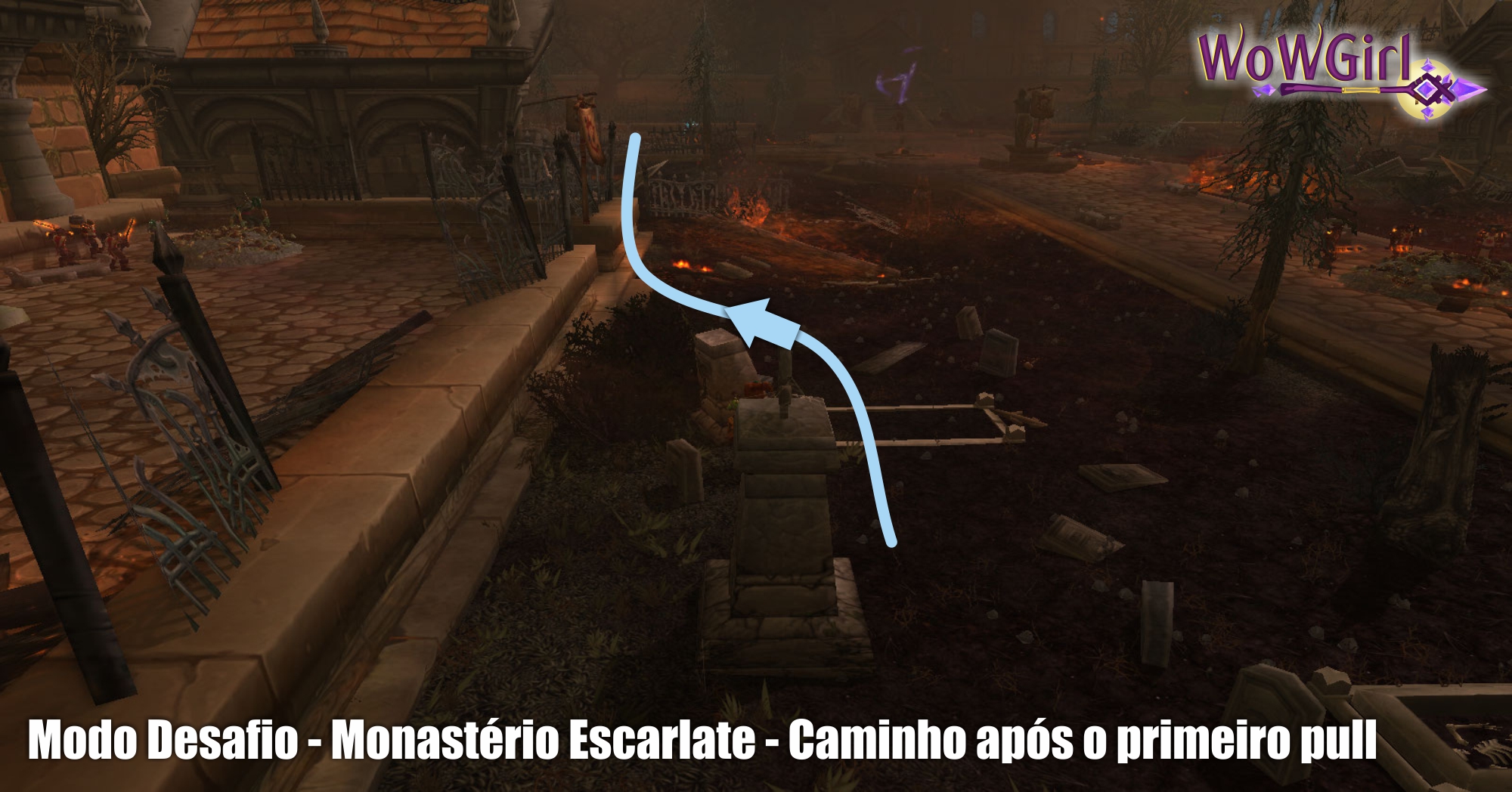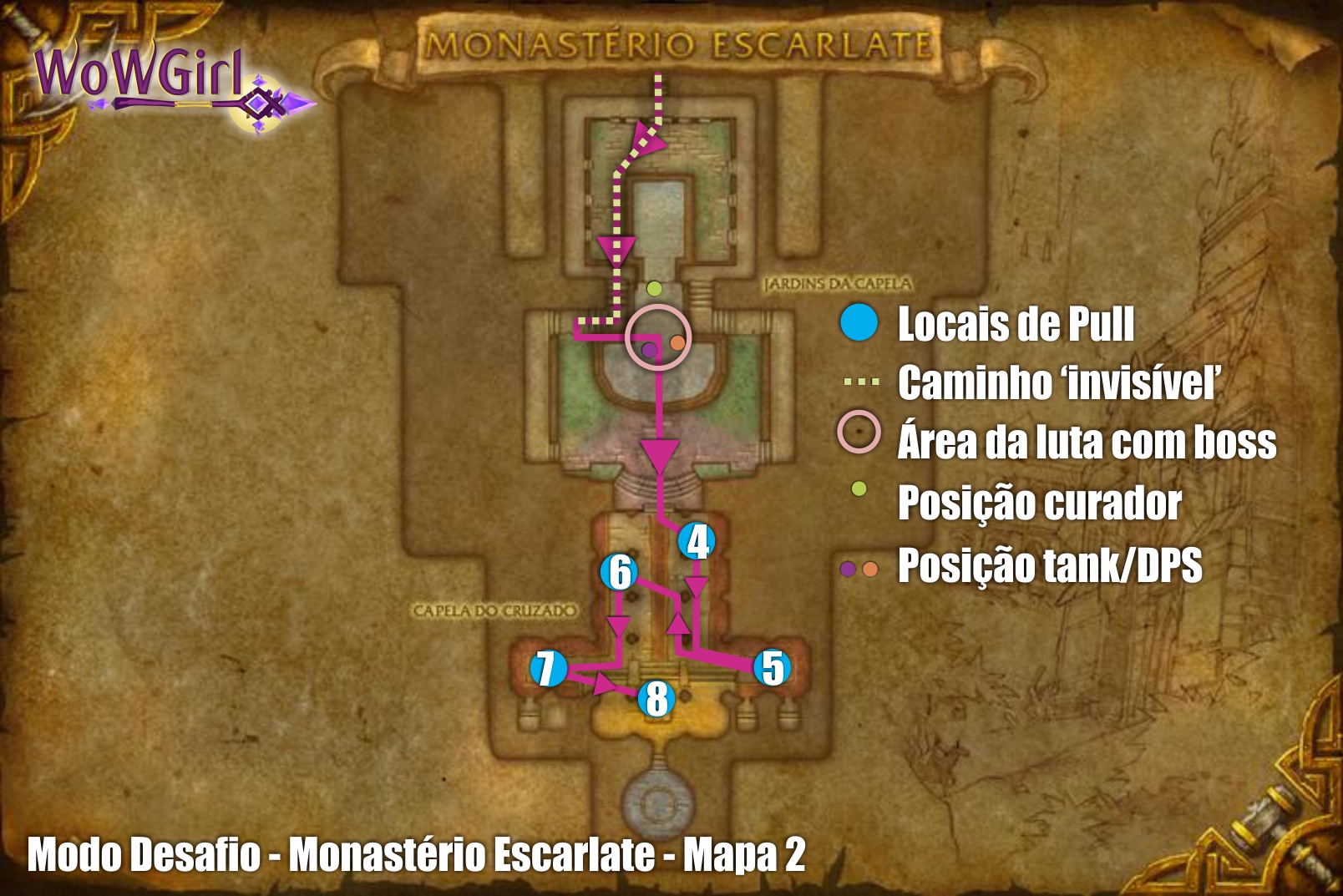 Dentro da igreja você vai encontrar, de novo, seus velhos conhecidos Purificador Escarlate, Fanático Escarlate, Judicante Escarlate e Zelote Escarlate. Tente mata-los na ordem em que foram mencionados aqui, e seguindo a ordem de pulls no mapa 2. Aproveitem os pilares da sala pra otimizar o posicionamento, e dar LoS nos monstros sempre que necessário. Comecem limpando os adds pela esquerda, e use stun, root, slow e qualquer outro cc sempre que necessário. Mate TUDO dentro da igreja antes de começar com a próxima boss, e tomem cuidado para que os espíritos não curem nenhum add ali. Nessa parte o dano dos monstros no grupo pode ser muito, muito alto, e um wipe é fácil; por isso, repetindo: use stun, root, slow e qualquer outro cc sempre que necessário