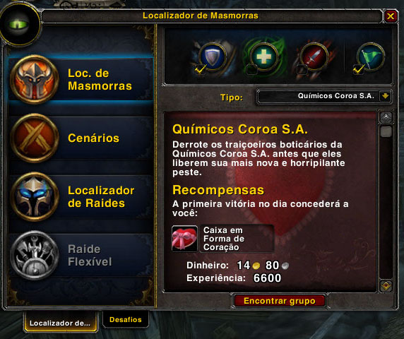 Já o Foguetão do Amor, pode ser adquirido como recompensa na Caixa em Forma de Coração. Para conseguir essa caixa, você precisará de um personagem no nível 89 ou 90. Com seu personagem, basta entrar no Localizador de Masmorras e completar a masmorra “Químicos Coroa S.A”, que só estará disponível uma vez por dia, durante o período do evento. A chance de conseguir o foguetão é de apenas 0.03%.