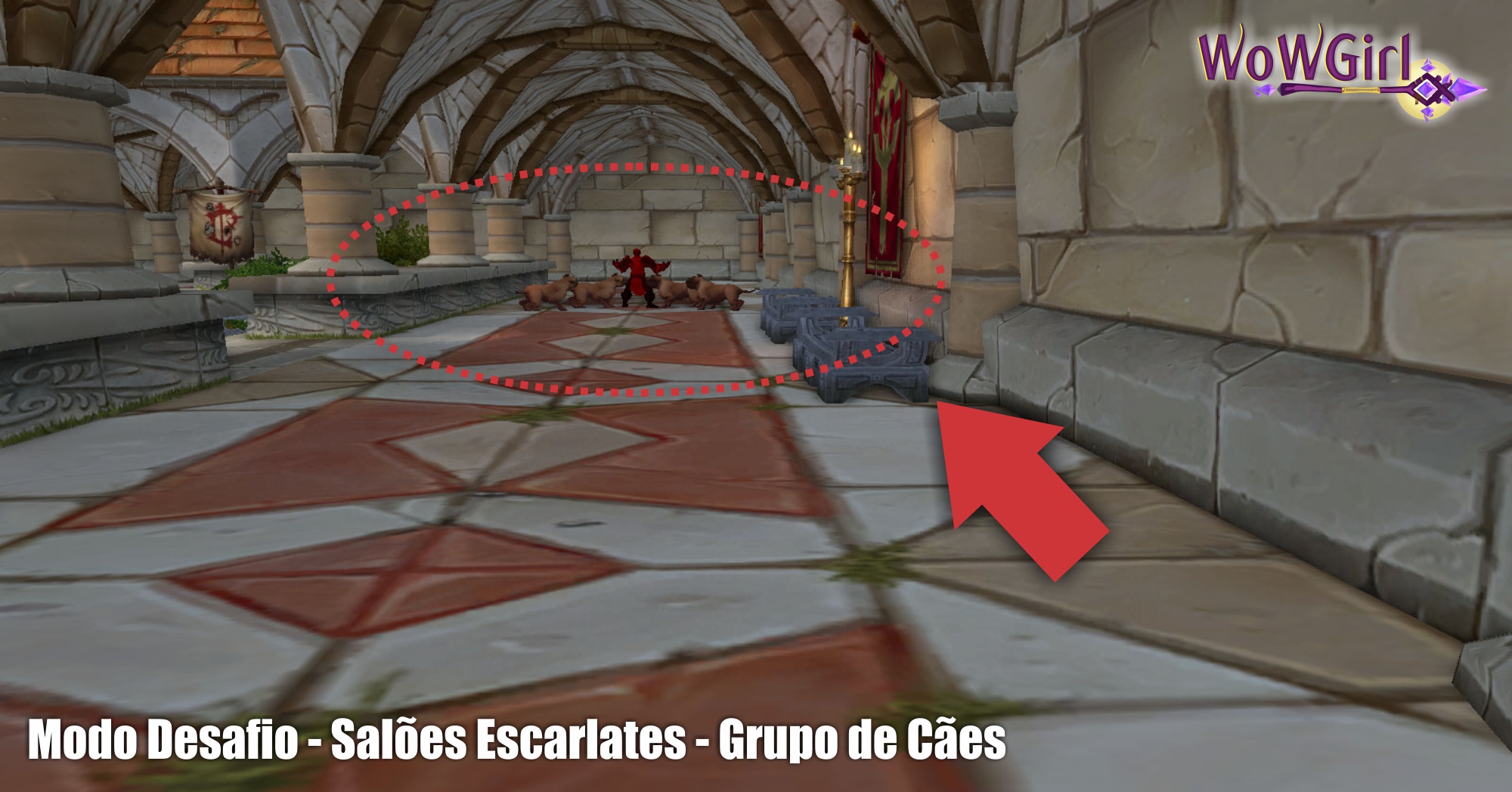 Caso você tenha optado por enfrentar a patrulha do corredor antes do chefe, basta agora seguir até o próximo corredor e começar uma pequena série de micros pulls. Nesse corredor vocês irão encontrar alguns Guardiões do Salão Escarlate e Tesoureiros Escarlate. Foquem toda sua atenção primeiramente no Tesoureiro, pois eles causam muito dano com o seu ataque, Jogar Estátua. Os Guardiões também irão dar um pequeno trabalho, pois eles irão atordoar alguém aleatoriamente por 3s, alem de colocar um debuff chamado Talhar Armadura. Por isso puxar a sala toda aqui pode não ser tão boa ideia. A menos que seu grupo tenha meios de atordoar a maioria deles enquanto os matam no dano aoe.