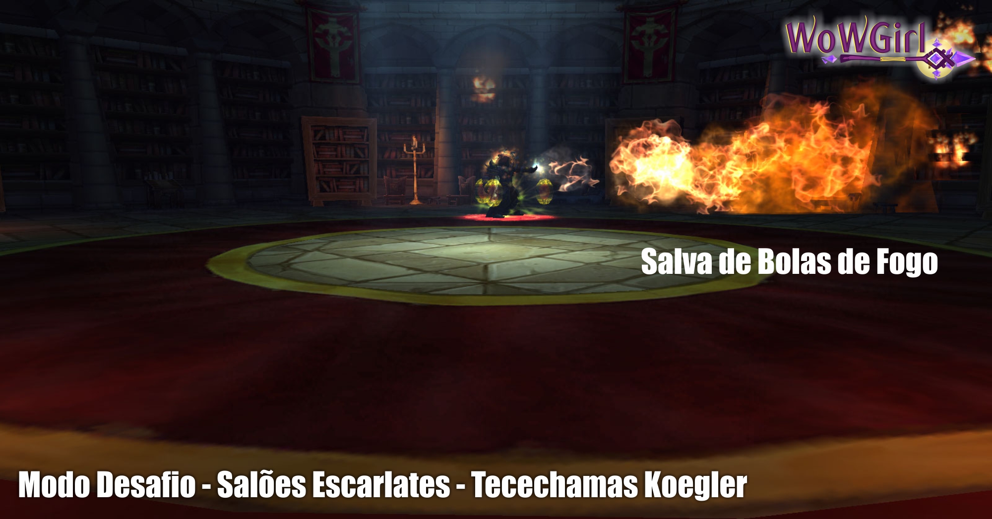 Ultimo chefe. Tecechamas Koegler é fogo na roupa. Ele praticamente taca fogo em tudo. Nas estantes, no jogador, faz bafo de dragão rodando a sala entre outras. Mas nem é difícil por causa disso. Vocês só precisam ficar atentos com a movimentação, evitando o ataque circular, Sopro do Dragão Maior, e evitando passar perto das estantes que forem afetadas pelo Queimador de Livros. Curandeiros, fiquem atentos quando ele usar Salva de Bolas de Fogo, pois isso irá causar muito dano em todos ao mesmo tempo.