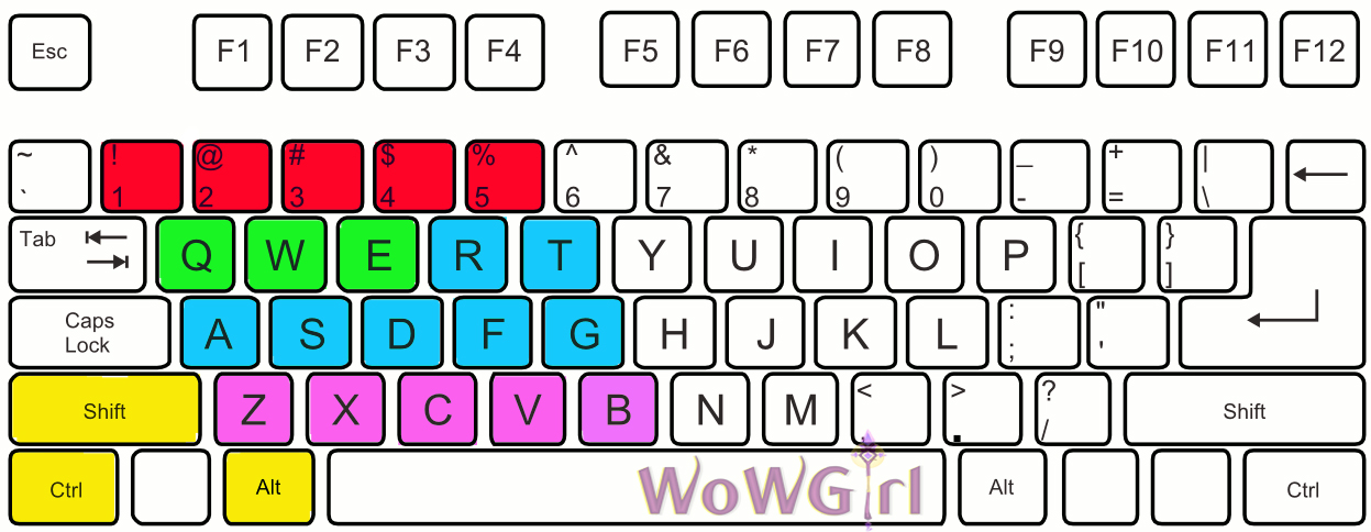 - Teclas em azul: teclas de fácil acesso, usar para cooldowns de ataque e defesa e habilidades mais usadas;