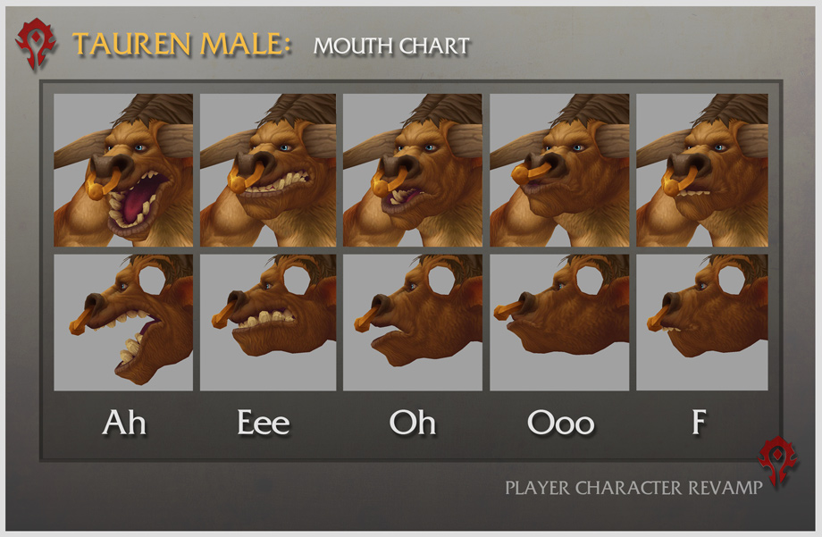 Como o sistema de animação facial funcionou muito bem com os pandarens em Mists of Pandaria, queríamos que os modelos atualizados tivessem a mesma vivacidade, a mesma emoção. Anteriormente, os modelos dos personagens só tinham a mandíbula para ser animada, mas agora podemos dar movimento às sobrancelhas, olhos, bochechas e boca. Agora, podemos fazer eles sorrirem, se zangarem e falarem.