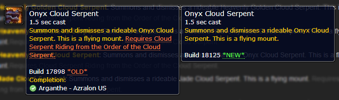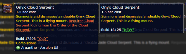 No dataming recente feito pelo Wowhead, algumas mudanças em relação a montarias foram publicadas. Parte delas lista todas as Serpentes das Nuvens como independentes da licença específica de voo para este tipo de montaria.