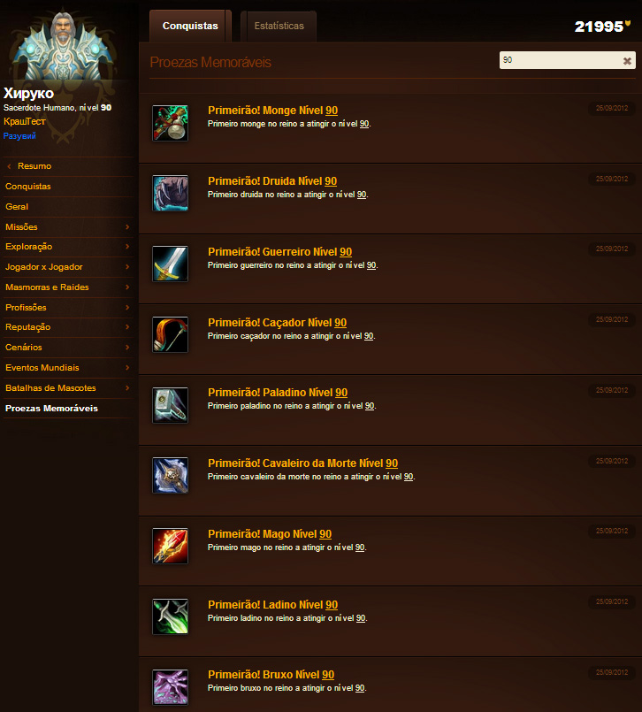 Entre as conquistas mais impressionantes, ele conseguiu Primeirão (Realm First) de todas as classes NO MESMO DIA. O jogador afirma que transferiu seu personagem para um servidor de população baixa e contou com a ajuda de seus amigos da guilda para matar os outros competidores, enquanto upava seus personagens utilizando multibox (programa para controlar vários personagens ao mesmo tempo).