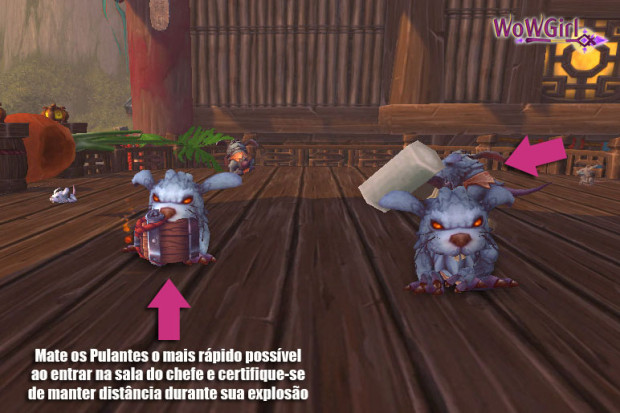 Aqui é bom você combinar com algum dos DPSs para atingir todo e qualquer Pulante, fazendo assim com que ele pare e detone a bomba longe do seu grupo (sempre fique longe de qualquer Pulante que esteja pulando parado). O tanque por sua vez, deve puxar todo e qualquer outro coelho que estiver no caminho e seguir para a sala do próximo chefe rápido. O chefe só irá aparecer quando os Pulantes e Ratamarretas que estiverem originalmente na sua sala, forem mortos. Os DPSs devem focar nesses adds primeiro, tentando manter algum dano em área. O tanque por sua vez deve pegar todas as marretas disponíveis e fazer uso delas.