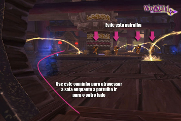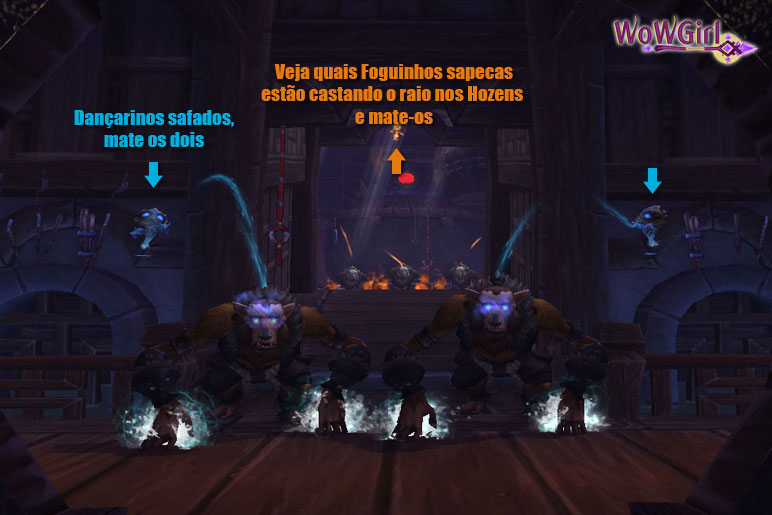 Quando os dois últimos Hozens iniciais estiverem morrendo, o grupo pode começara a seguir adiante e detonar alguns dos barris na sala seguinte. Em frente terão dois hozen lutando entre si. O tanque deve puxá-los e seguir para a sala do chefe. Lá, se tiver uma Trombeta de Batalha, faça uso dela. E os DPSs devem usar os barris que estarão rodando pela sala para matar o grupo de Hozen Farristas.