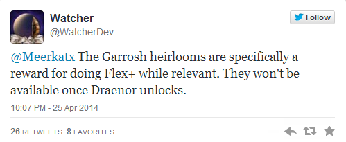 Como diz o dev Watcher em seu Twitter, a partir do momento que o Warlords of Draenor entrar em cena, não teremos mais o drop desses itens de herança no Garrosh. Se você quer obter as armas de herança para ganhar bônus em leveling, sugiro que comece a correr atrás de raides flex/normal/heroicas para seus personagens de nível 90.