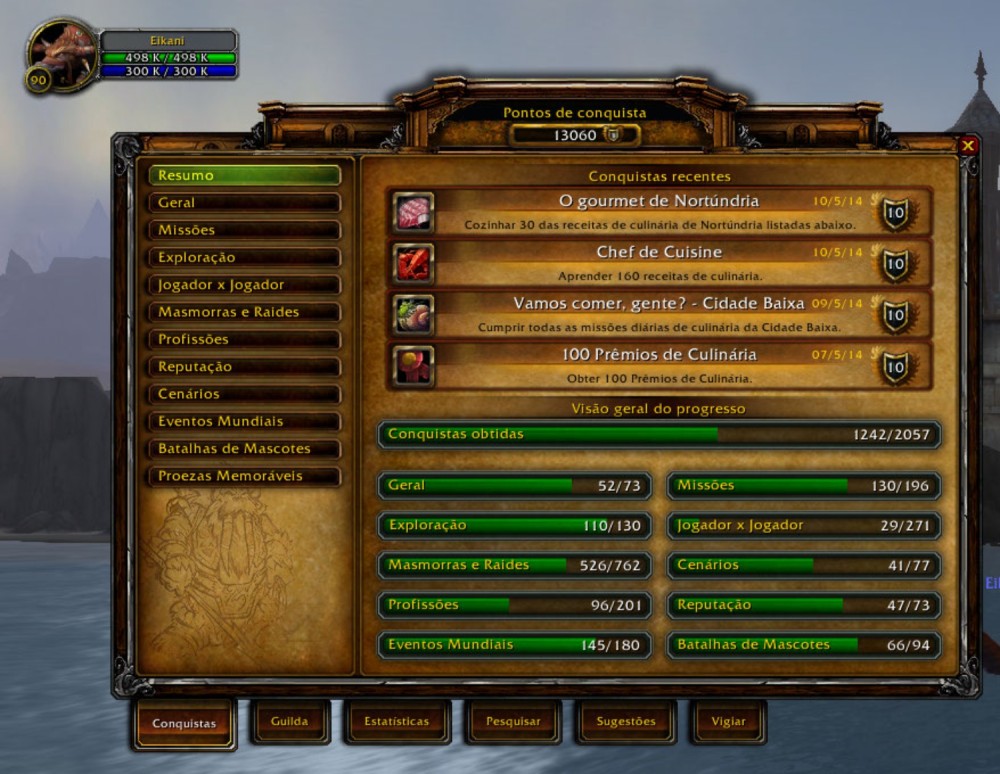 Desde que comecei meu projeto, com pouquissimo tempo de jogo (e uma ajuda linda da própria Arganthe), já ganhei quase 3k de conquistas, basicamente, fazendo masmorras e raides antigas – pra muitos meta me faltavam pouquissimas conquistas! – pescando, cozinhando e passeando por aí. Já consegui 5 montarias de conquistas-meta, vários pets, e, ainda que eu sempre tenha sido a embaixadora do mantra WoW-é-felicidade, acabei descobrindo um novo jogo cheio de receitas, ingredientes, peixes, mecânicas felizes em lutas, mobs interessantes, itens de saque engraçados, conhecendo mais da lore do jogo e, mais do que nunca, vi que quem diz que “não tem nada pra fazer no WoW” não sabe o que está perdendo.